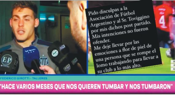 La sospecha de que son perjudicados está instalada en barrio Jardín desde hace un buen tiempo, pero las manifestaciones siempre se mantuvieron en el ámbito privado. Ahora, la bronca se hizo pública, pero no tuvo respaldo. Horas más tarde, a través de su cuenta en Instagram, Girotti salió a pedir disculpas. “Mis intenciones no fueron ofender”, dijo –o le hicieron decir–. Pero eso no fue todo, ya que más allá de la falta de apoyo, Talleres debió soportar burlas en redes sociales de dirigentes del fútbol argentino por la eliminación, entre ellos Maximiliano Levy, presidente de Almirante Brown de Isidro Casanova y prosecretario ejecutivo de la AFA.