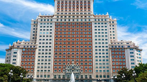 El edificio España es uno de los primeros rascacielos levantados en Madrid e incluso en el momento de su construcción (1953) fue el más alto del país, con sus 117 metros y sus 26 plantas.