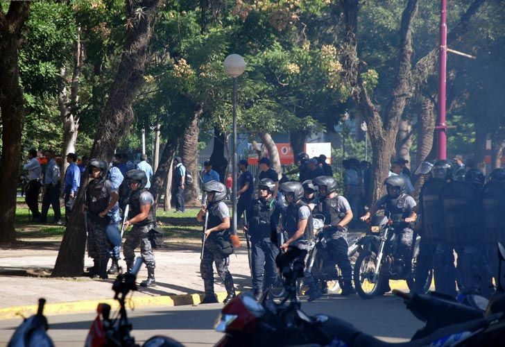 Los manifestantes se toparon con un fuerte vallado policial sobre la plaza 25 de Mayo, en inmediaciones a la Casa de Gobierno, lo que generó un choque con los uniformados que reprimieron mediante el uso de un camión hidrante, gases lacrimógenos y disparos de bala de goma.