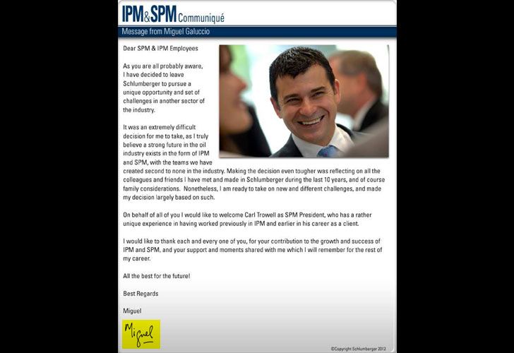 El nuevo CEO de YPF se convirtió en el director de la firma IPM propiedad de Schulmeberger. Esta compañía, según pudo saber este portal, no suele destinar por más de tres años a sus directores en un mismo país extranjero, pero Galuccio siguió dos años más en Londres.