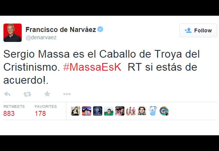 “Massa es un flú flú”, “Es el Caballo de Troya de Cristina”; “Massa es Cristina” “No dice nada de nada” “Massa es kirchnerismo encubierto”; “No tiene nada de renovador”, son algunas frases que Francisco De Narváez le dedicaba al diputado del Frente Renovador apenas un año atrás cuando competían entre ellos. Aquella pelea, incluso, llegó a convertirse en jingle de campaña: “Massismo es más de lo mismo, massismo es más kirchnerismo, massismo es más de lo mismo y nadie lo puede negar”. Pero hoy todo cambió y la elección de 2015 los encontrará unidos.