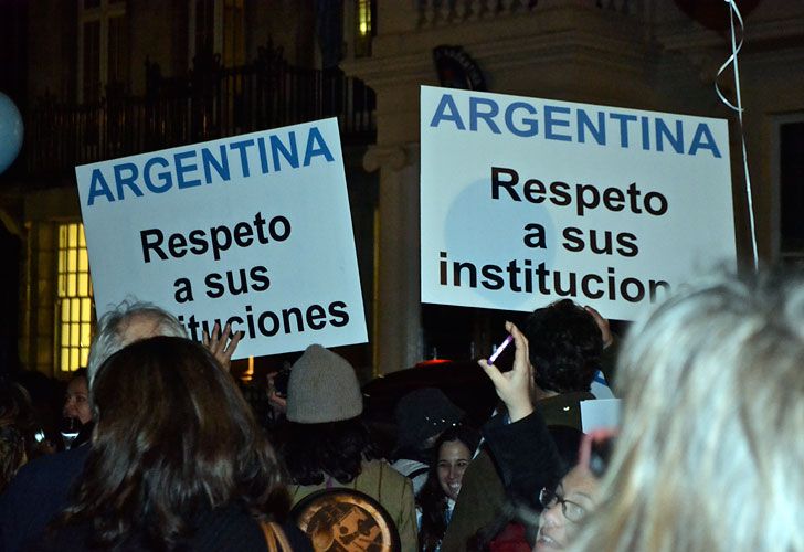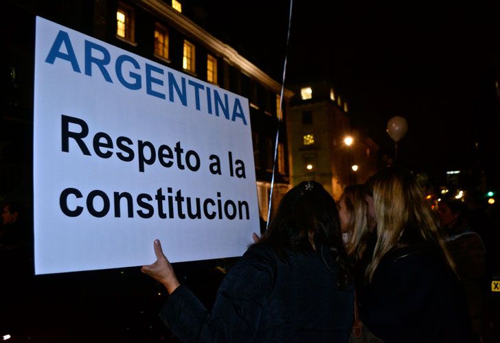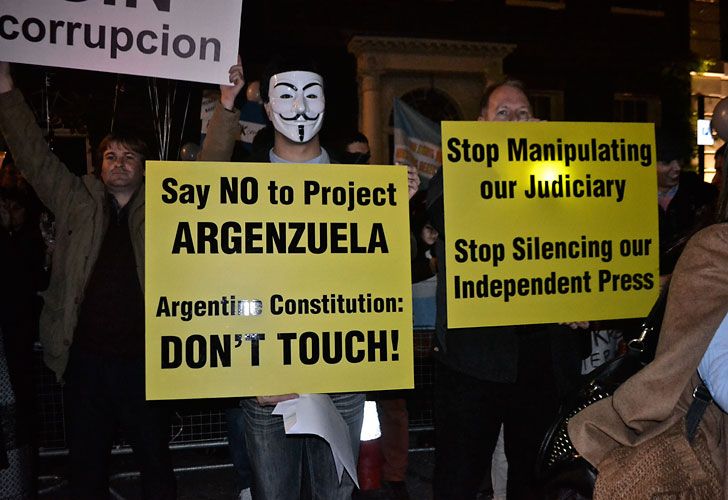 Los manifestantes, también convocados por redes sociales, llevaban banderas y camisetas argentinas, globos celestes y blancos, y pancartas con frases en inglés y castellano, con leyendas como "digan no al proyecto Argenzuela. No toquen la Constitución argentina".