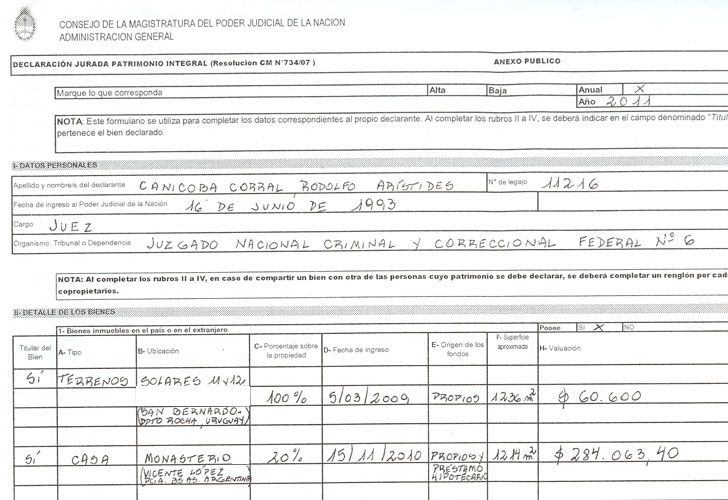 En su presentación de bienes de 2011, Canicoba Corral había asegurado que esa misma propiedad de la calle Monasterio al 1600, en Vicente López, valía apenas $60.600 pesos, como un "terreno" en el cual construyó una "casa" el 15 de noviembre de 2010 en la zona norte del Gran Buenos Aires.