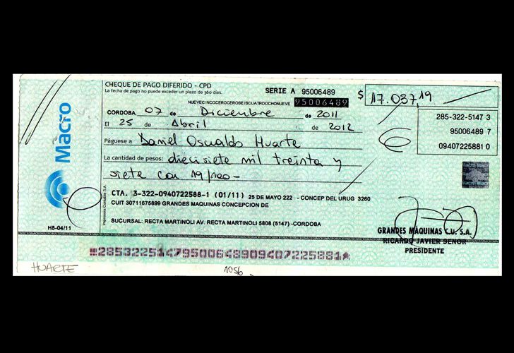 Y cuenta que ese no fue el único padecimiento con Grandes Máquinas. “Por el lado económico, me pusieron de rodillas: todos cheques posdatados. Me pagaban con esos cheques en agosto con fecha a cobrar recién en marzo, abril, mayo, todos sin fondos”, cuenta Huarte. Y dice que por entonces él les pedía cheques a cobrar más pronto, pero que en la empresa le decían que no se preocupara que en noviembre se los iban a cambiar.